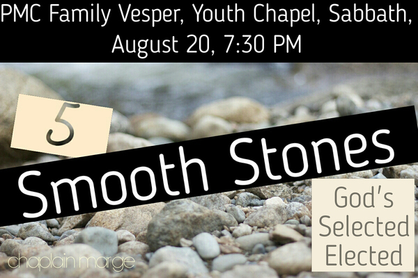 Join Chaplain Marge for "Smooth Stones: God's Selected Elected" on Sabbath, August 20, 7:30 p.m. at the PMC Youth Chapel.