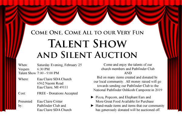 hall, 6562 Naomi Road, Eau Claire, MI 49111 - 6:30 Vespers - 7:00 Talent