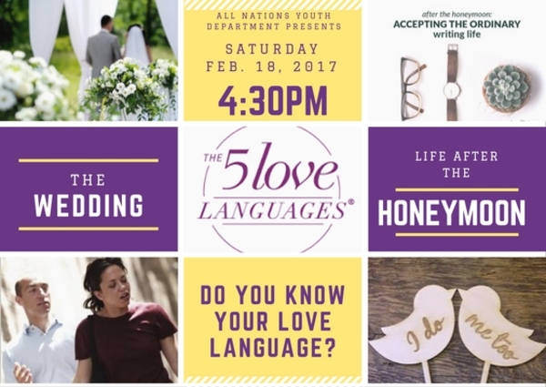 You, your family, and friends are cordially invited to attend The 5 Love languages, Wedding Ceremony presented in the form of a play. No RSVP needed. This fellowship AY will facilitate and unpack the 5 Love Languages, as described by author, Gary Chapman. If you haven't before, you will learn which Love Language specifically speaks to you.