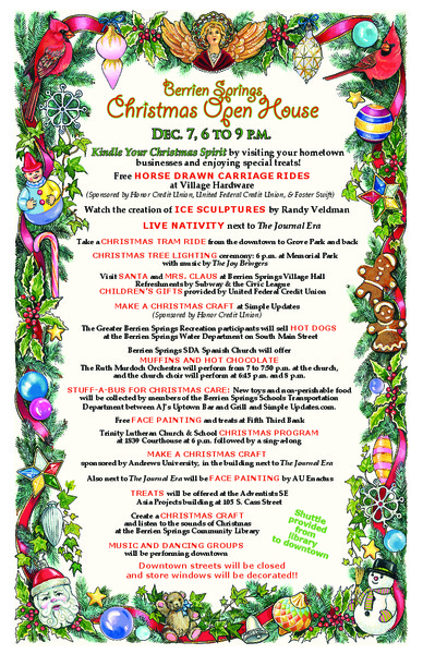 Kindle your Christmas Spirit by visiting Downtown Berrien Springs on December 7 from 6–9 p.m. and enjoy some special treats, music and dance groups perform, ice sculptures, Christmas tree lights, face-painting done by Enactus, and much more! Come out and bring your friends and family, and enjoy this wonderful event.