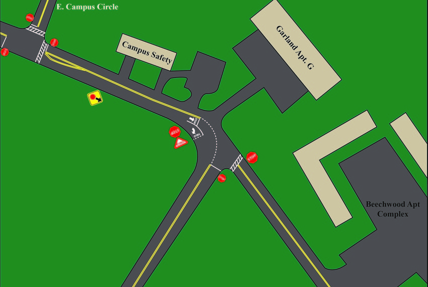 Additionally, the traffic pattern at this intersection will be changed to a 3-way stop with one yield for those turning right onto Garland Avenue. This will be similar to the traffic pattern at the East Campus Circle/Timberland intersection. The attached map indicates where these signs will be installed.
