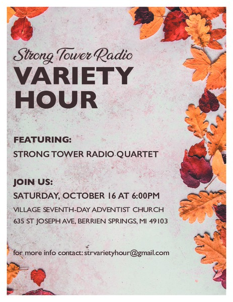 Strong Tower Radio will be in Berrien Springs, Michigan, the third weekend of October to record local talent for their Variety Hour broadcast. Everyone is welcome to come listen in on the old-fashioned Variety Hour show on Oct. 16, 6 p.m., at the Village Church.