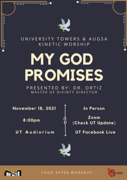 Are you a graduate student seeking to connect with God and other students? Come and join us for a time to worship together as a graduate student community! It's just 30 minutes! Our theme this semester is "My God Promises." We are looking into the Word of God to see the countless promises that God makes and keeps! Join us for music, worship, food and fellowship. You can join us in person in the University Towers auditorium or via Facebook Live (@UTTowers or @AUGSA2020). Hope to see you there!