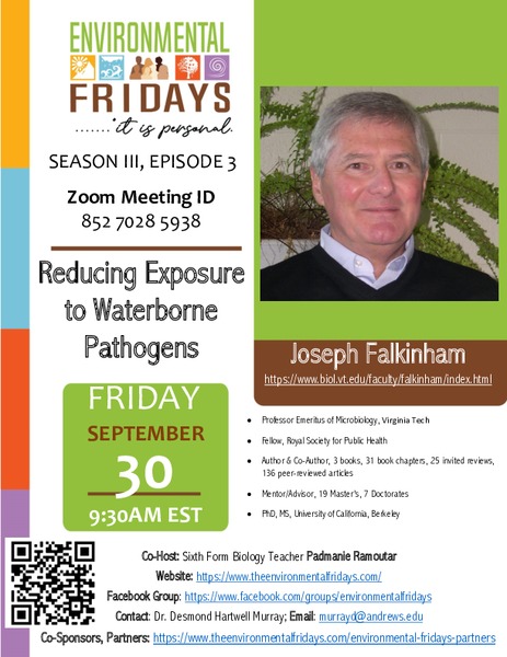 Join us this Friday, Sept. 30, 2022, for Environmental Fridays, Episode 2, at 9:30 a.m. EST to listen and learn about an amazing conservation effort in Trinidad—Reducing Exposure to Waterborne Pathogens—with Virginia Tech Professor Emeritus of Microbiology Joseph Falkinham III, PhD.