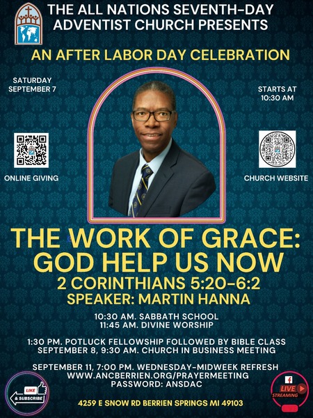Join us for an uplifting worship experience this Saturday, September 7, @ 11:45 am as Martin Hanna presents "The Work of Grace: God Help Us Now." Sabbath School begins at 10:30 am. Lunch is provided followed by Bible Class.