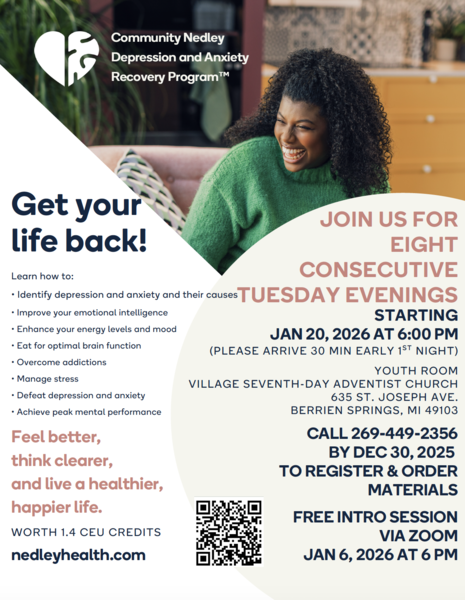 Join us for eight consecutive Tuesday evening starting Jan. 20, 2026, at 6 p.m. The program will be held in the Youth Room at Village Seventh-day Adventist Church (635 St. Joseph Ave, Berrien Springs, MI 49103). Call 269-449-2356 by Dec. 30, 2025, to register and order materials.