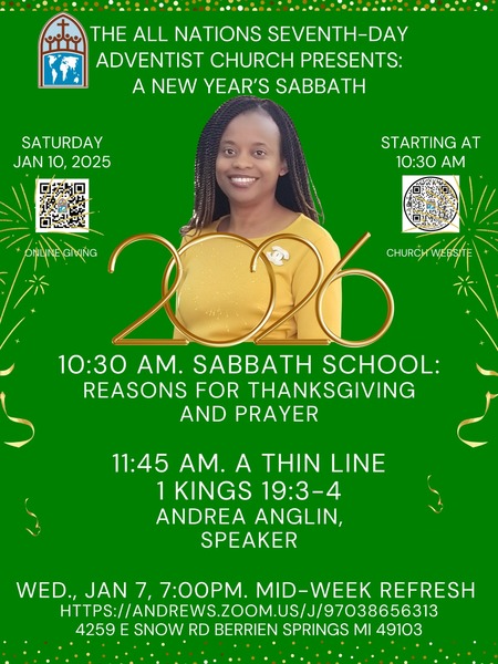 Join us for our worship experience at the All Nations SDA Church this Saturday, January 10, at 11:45 am, as Andrea Anglin presents "A Thin Line." Adult and Children's Sabbath School begins at 10:30 am. We look forward to seeing you there!