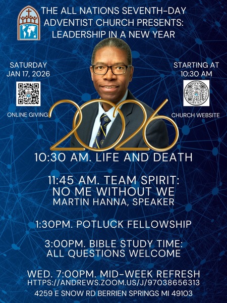 Join us for our worship experience at the All Nations SDA Church this Saturday, January, 17, at 11:45 am, as Martin Hanna speaks on "Team Spirit: No Me Without We." Adult and Children's Sabbath School begins @ 10:30 am. We will have a fellowship luncheon after the service, followed by a Bible Study. See you there!
