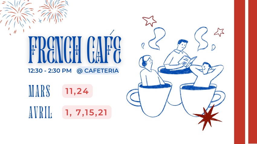 French café is happening again this semester. It is a time where we can eat and share in French at the cafeteria (close to the piano). This event is open to students, faculty, staff and community members.