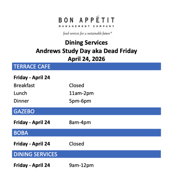 Please note the hours on Friday, April 24, for Dining Services.