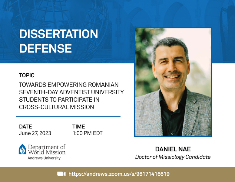 The dissertation defense for Doctor of Missiology candidate Daniel Nae will take place Tuesday, June 27, at 1 p.m.
