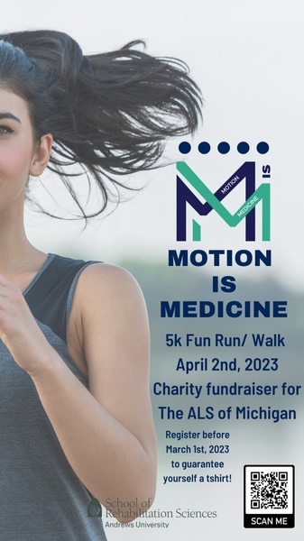 The Andrews University Physical Therapy department is hosting a 5k Fun Run/Walk on April 2, 2023. To receive a free t-shirt, sign up by March 12, 2023. Register at https://auptmotionmedicine.wixsite.com/home.