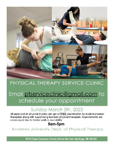 The Physical Therapy Service Clinic will take place on Sunday, March 5, from 9 a.m.–5 p.m.