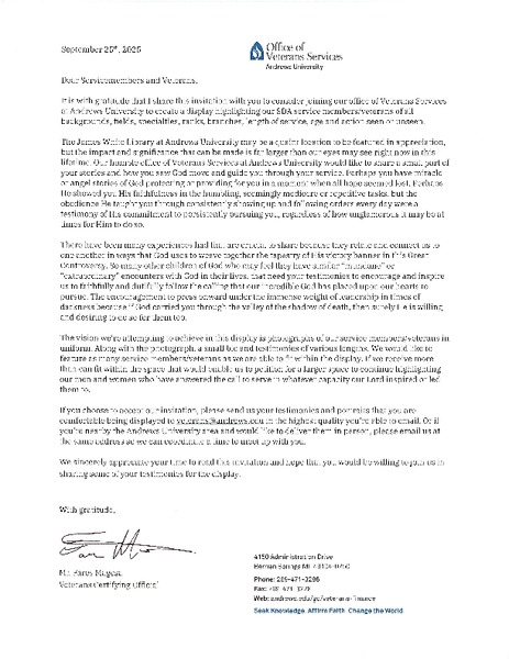 When: Tuesday, Oct. 7, at 7 p.m. Where: Newbold Auditorium Who: Adventist Colleges Abroad will be hosting an information meeting about our schools aborad. Information will... read moreVeterans Display: Invitation 2025
