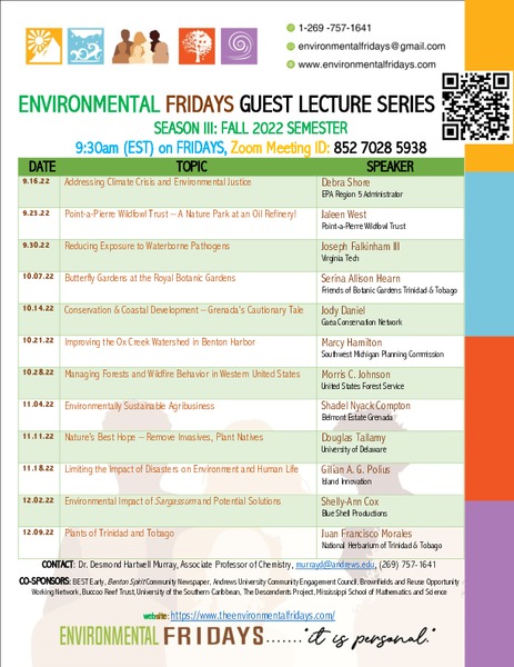 Join us for Environmental Fridays Season III, fall semester 2022! The season features lectures by 12 different individuals on a variety of topics, with the presentations taking place on Fridays at 9:30 a.m. via Zoom. ...