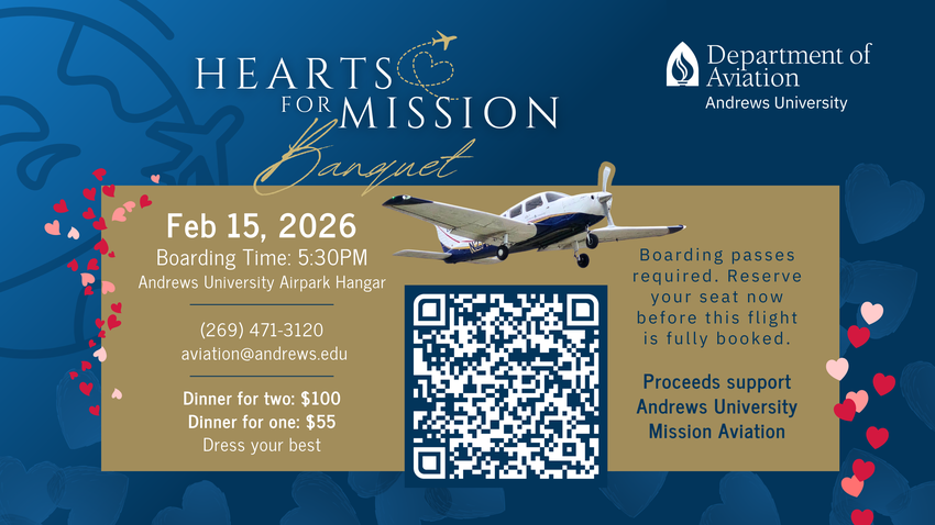 Andrews University Department of Aviation warmly invites you to the inaugural Hearts for Mission Banquet, an elegant and purposeāfilled evening dedicated to inspiring, celebrating and advancing the work of Adventist mission aviation around the world. ...