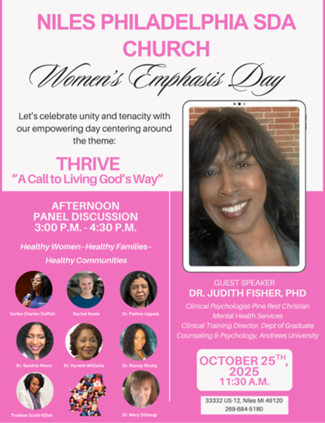Join us for a power-packed Women's Emphasis Day at the Niles Philadelphia Seventh-day Adventist Church. Our theme is "Thrive: A Call to Living God's Way." The day begins at 11:30 a.m. with special guest speaker Judith Fisher, PhD,... read moreEau Claire SDA Church Service, Oct. 25