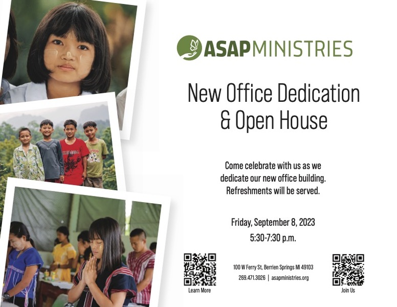 You are invited to join ASAP Ministries for our new office building dedication and open house on Friday, Sept. 8, 2023, from 5:30–7:30 p.m., at 100 W Ferry St, Berrien Springs. Refreshments will be served.