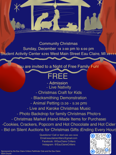 Celebrate Community Christmas—Come experience a celebration of Christ's birth from 3–6 p.m. on Sunday, Dec. 18, at the Student Activity Center in downtown Eau Claire located at 6295 West Main Street, Eau Claire, MI. The event also features...