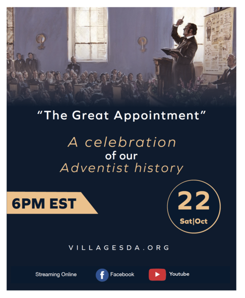 Join us at Village SDA Church this Saturday evening at 6 p.m. for a special, hour-long vespers program titled "The Great Appointment."