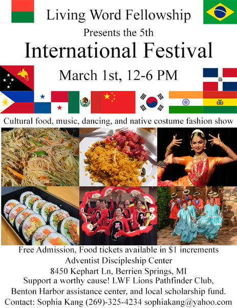 Everyone is welcome to join us in celebrating our diversity at our 5th International Festival on March 1, from 12–6 p.m. at the Adventist Discipleship Center, 8450 Kephart Ln, Berrien Springs, MI 49103. We have the following countries... read moreStevensville Seventh-day Adventist Church, Feb. 29