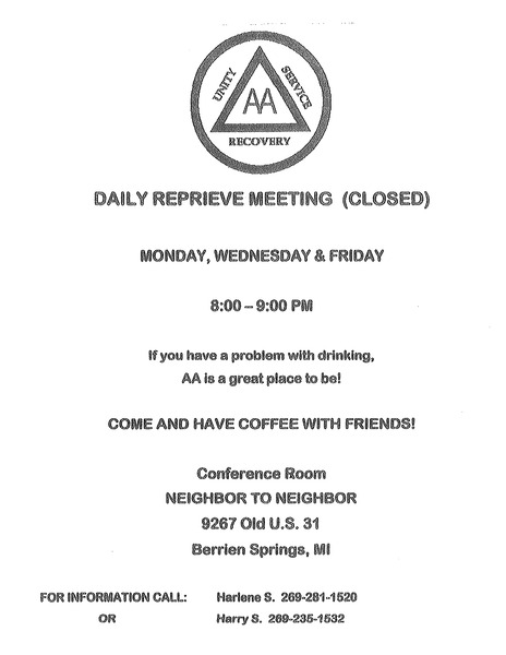 Alcoholics Anonymous Daily Reprieve Meeting (Closed) When: Monday, Wednesday and Friday, from 8–9 p.m. If you have a problem with drinking, AA is a great place to be! ...