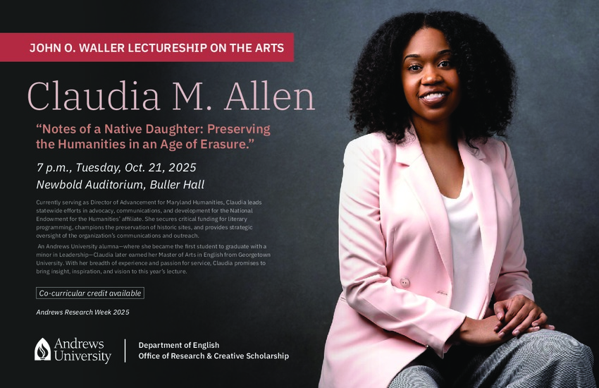 Join us for the John O. Waller Lectureship at 7 p.m. on Tuesday, Oct. 21, 2025, in Newbold Auditorium, Buller Hall. Claudia M. Allen will be presenting "Notes of...