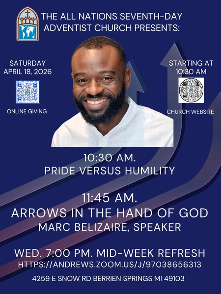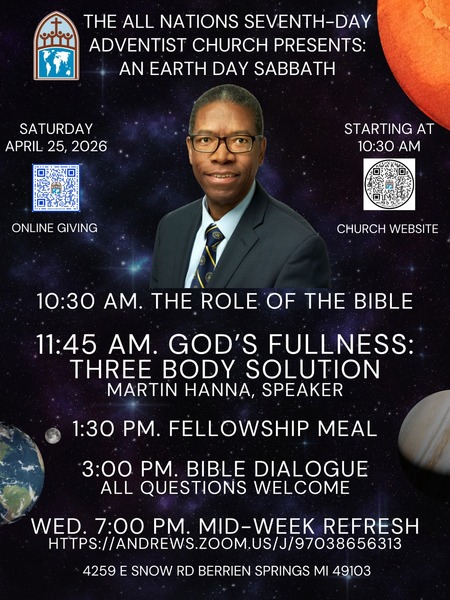 Join us for our worship experience at the All Nations Seventh-day Adventist Church this Saturday, April 25, at 11:45 a.m. as Martin Hanna speaks on "God's Fullness: Three Body Solution." Adult and Children's Sabbath School begins at 10:30...